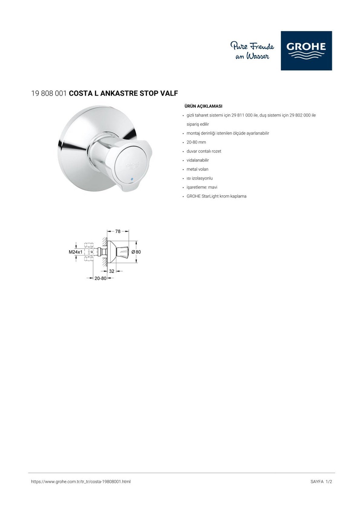 Grohe Costa L Ankastre Stop Valf Krom
